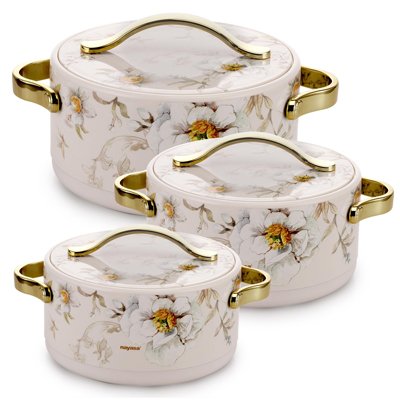- Elegant Design and Luxurious Appeal: The Nayasa Insulated Casserole stands out with its sophisticated design and floral autumn print, featuring a glossy finish, unique color combinations, and a luxurious golden handle and top handle. These elements not only add a touch of glamour but also make it a stylish centerpiece for special occasions and celebrations.